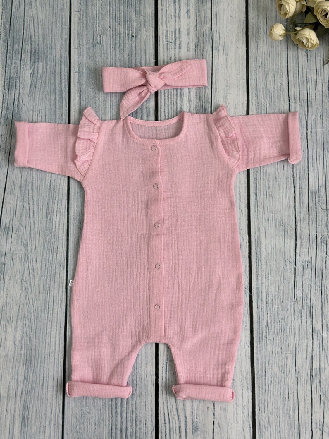 336-Р. Комбинезон с повязкой для девочки из муслина, хлопок 100%, размеры 56,62,68, розовый