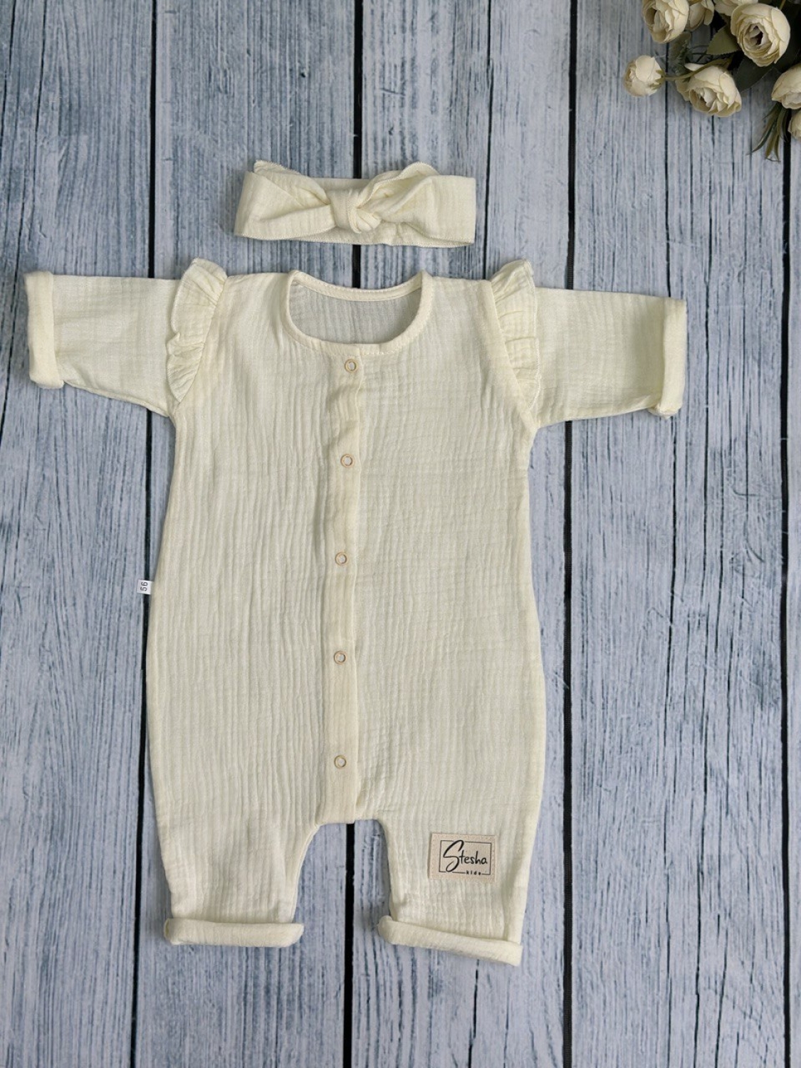 Теги: Купить оптом детский комбинезон . 336-СЛ. Комбинезон с повязкой для девочки из муслина, хлопок 100%, размеры 56,62,68, сливочный цена,отзывы официальный сайт "Стеша Армавир"